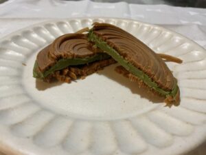 - どんなお菓子?: 何層にも重なったパイ生地をぐるぐると円盤状に焼き上げ、濃厚なピスタチオチョコレートをサンドしたお菓子です。