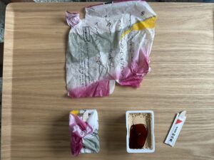 風呂敷のような個包装を丁寧に解きます。この時、包み紙を大きく広げて「ランチョンマット」のように使うと、きな粉がこぼれても安心です。 - 2. まずはそのまま、次に黒蜜